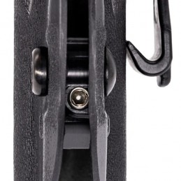 Opaskový klip má šířku 1,5" (cca 38 mm) a lze nastavit sklon i výšku pouzdra za opaskem.
